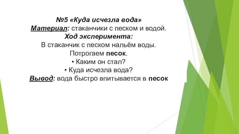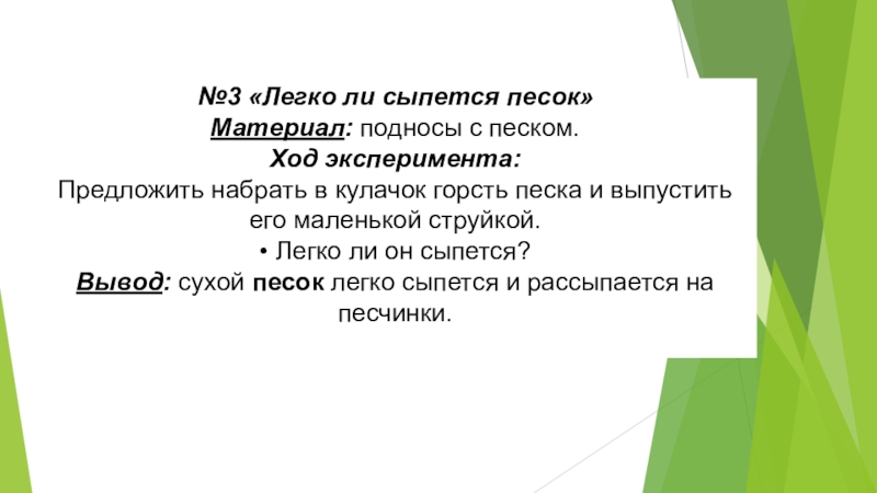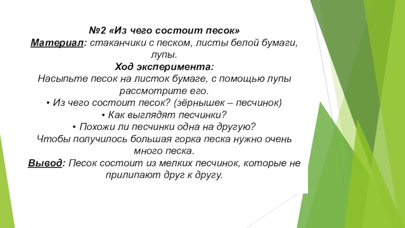 Вывод: Песок состоит из мелких песчинок, которые не прилипают друг к другу.