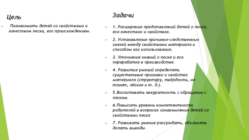 Познакомить детей со свойствами и качеством песка, его происхождением.