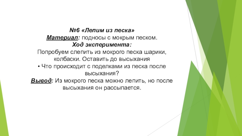 Вывод: Из мокрого песка можно лепить, но после высыхания он рассыпается.