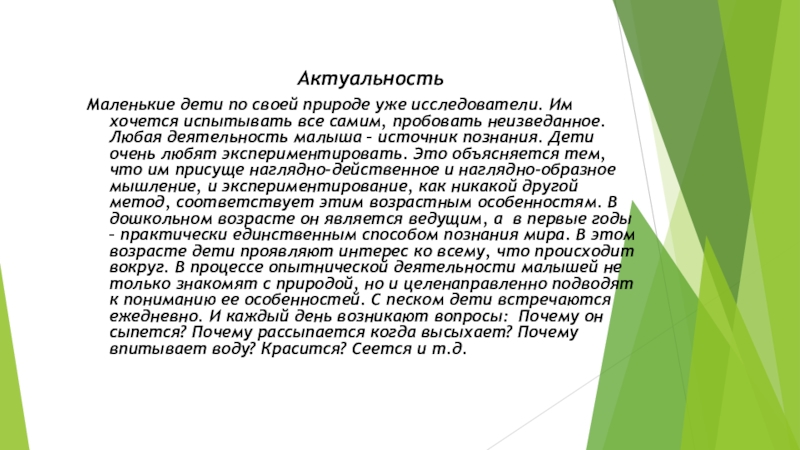 Маленькие дети по своей природе уже исследователи. Им хочется испытывать все самим, пробовать неизведанное. Любая деятельность малыша – источник познания. Дети очень любят экспериментировать. Это объясняется тем, что им присуще наглядно-действенное и наглядно-образное мышление, и экспериментирование, как никакой другой метод, соответствует этим возрастным особенностям. В дошкольном возрасте он является ведущим, а в первые годы – практически единственным способом познания мира. В этом возрасте дети проявляют интерес ко всему, что происходит вокруг. В процессе опытнической деятельности малышей не только знакомят с природой, но и целенаправленно подводят к пониманию ее особенностей. С песком дети встречаются ежедневно. И каждый день возникают вопросы: Почему он сыпется? Почему рассыпается когда высыхает? Почему впитывает воду? Красится? Сеется и т.д.