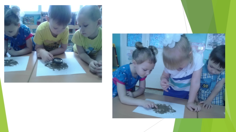 Материал: стаканчики с песком, листы белой бумаги, лупы.