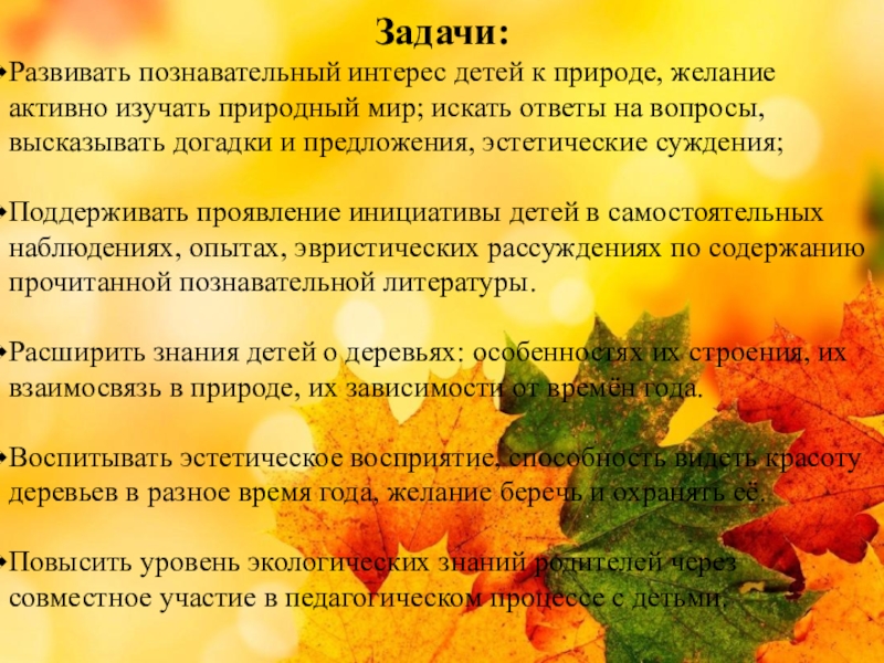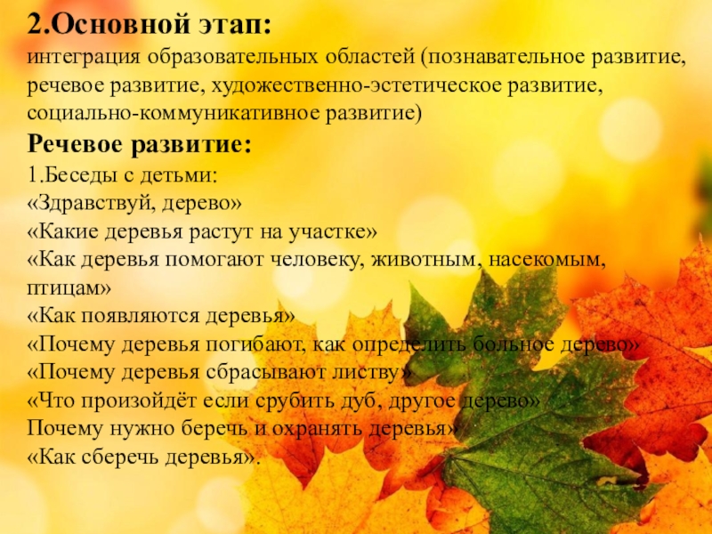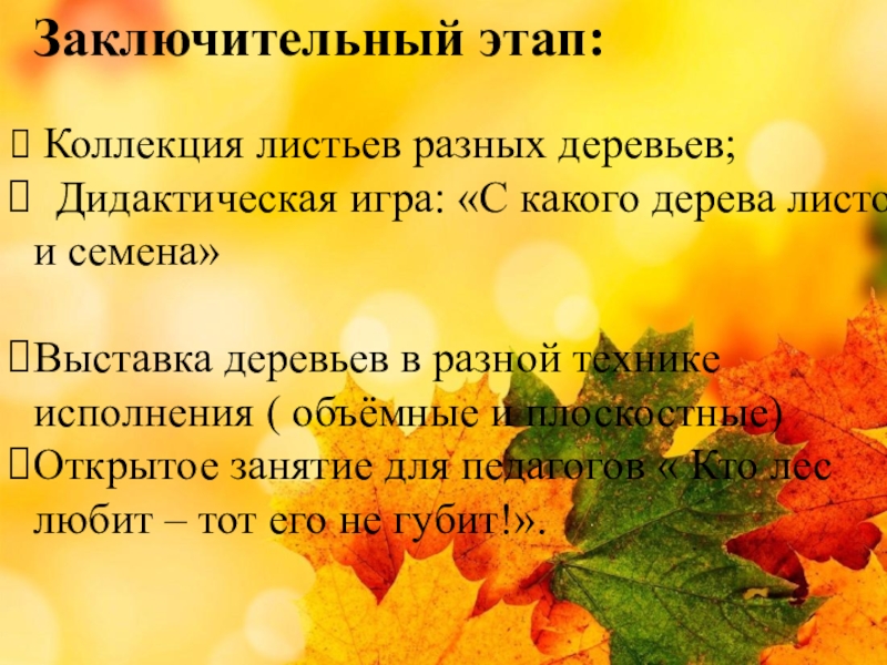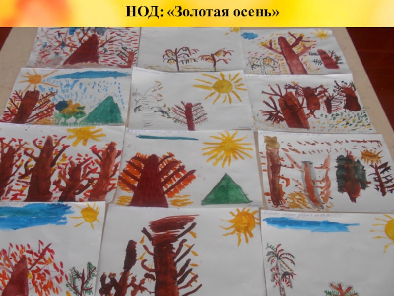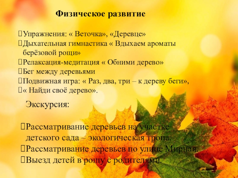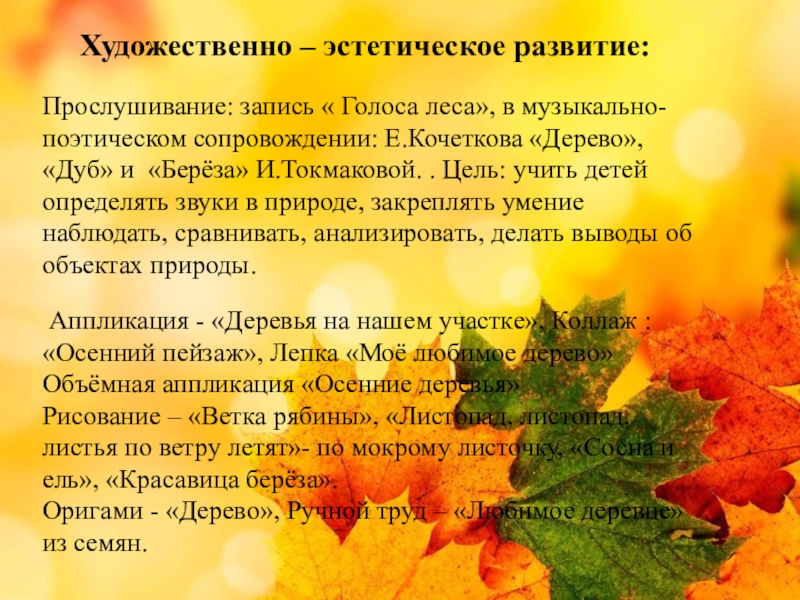 Рисование – «Ветка рябины», «Листопад, листопад, листья по ветру летят»- по мокрому листочку, «Сосна и ель», «Красавица берёза».