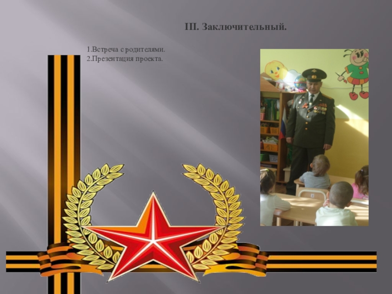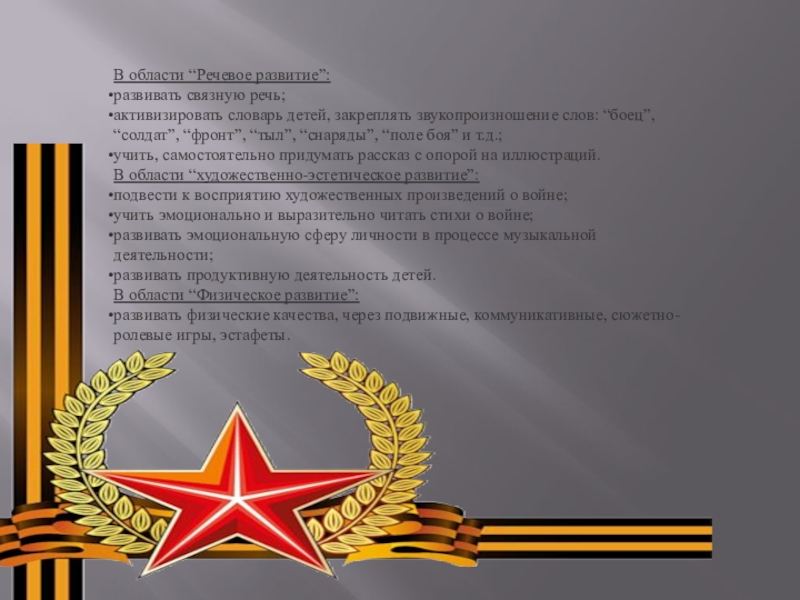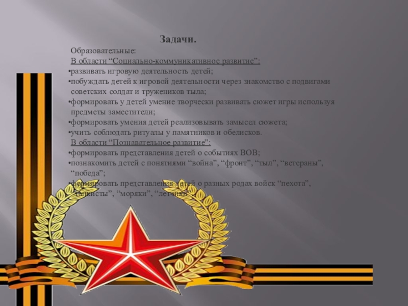 познакомить детей с понятиями “война”, “фронт”, “тыл”, “ветераны”, “победа”;
