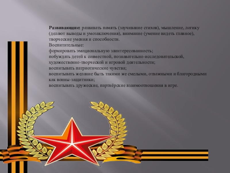 воспитывать желание быть такими же смелыми, отважными и благородными как воины-защитники;