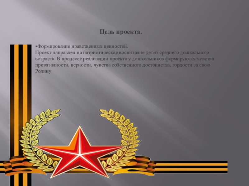 Проект направлен на патриотическое воспитание детей среднего дошкольного возраста. В процессе реализации проекта у дошкольников формируются чувства привязанности, верности, чувства собственного достоинства, гордости за свою Родину