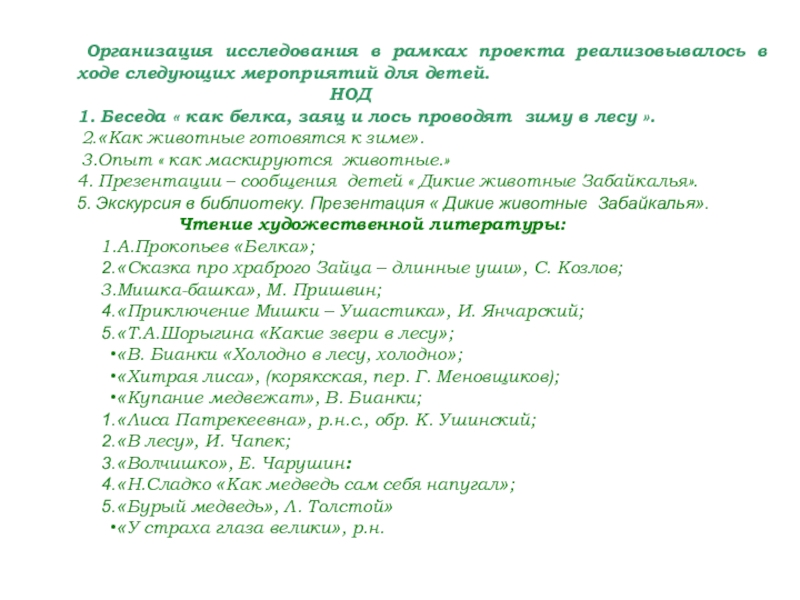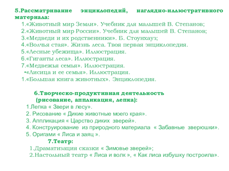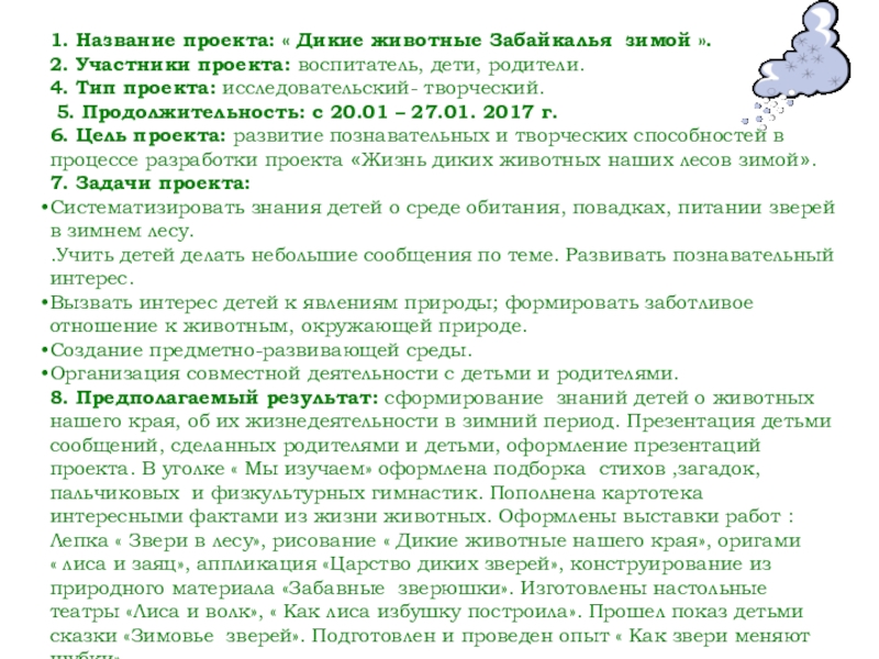 8. Предполагаемый результат: сформирование знаний детей о животных нашего края, об их жизнедеятельности в зимний период. Презентация детьми сообщений, сделанных родителями и детьми, оформление презентаций проекта. В уголке « Мы изучаем» оформлена подборка стихов ,загадок, пальчиковых и физкультурных гимнастик. Пополнена картотека интересными фактами из жизни животных. Оформлены выставки работ :