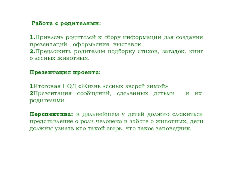 Перспектива: в дальнейшем у детей должно сложиться представление о роли человека в заботе о животных, дети должны узнать кто такой егерь, что такое заповедник.
