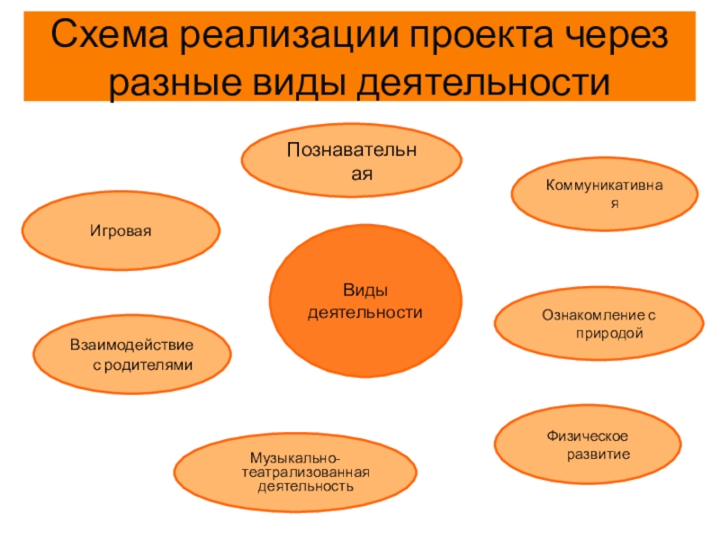 Слайд 3Схема реализации проекта через разные виды деятельности