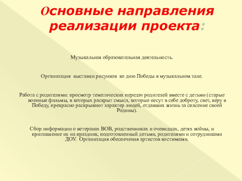 Сбор информации о ветеранах ВОВ, родственниках и очевидцах, детях войны, и приглашение их на праздник, подготовленный детьми, родителями и сотрудниками ДОУ. Организация обеспечения артистов костюмами.