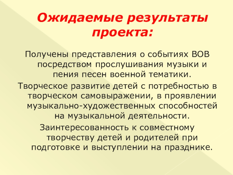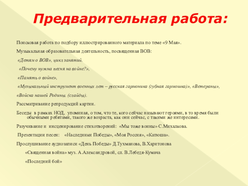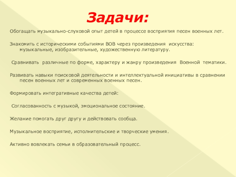 Обогащать музыкально-слуховой опыт детей в процессе восприятия песен военных лет.