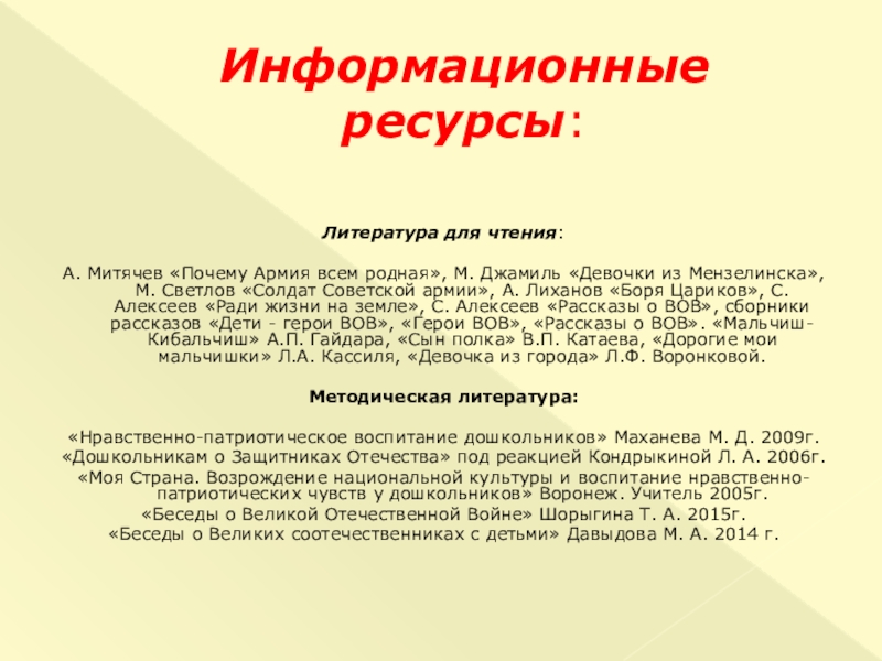 Джамиль «Девочки из Мензелинска», М. Светлов «Солдат Советской армии», А. Лиханов «Боря Цариков», С. Алексеев «Ради жизни на земле», С. Алексеев «Рассказы о ВОВ», сборники рассказов «Дети - герои ВОВ», «Герои ВОВ», «Рассказы о ВОВ». «Мальчиш-Кибальчиш» А.П. Гайдара, «Сын полка» В.П. Катаева, «Дорогие мои мальчишки» Л.А. Кассиля, «Девочка из города» Л.Ф. Воронковой.
