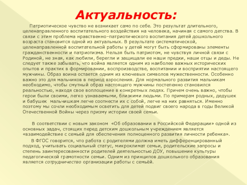 по себе. Это результат длительного, целенаправленного воспитательного воздействия на человека, начиная с самого детства. В связи с этим проблема нравственно–патриотического воспитания детей дошкольного возраста становится одной из актуальных. В результате систематической, целенаправленной воспитательной работы у детей могут быть сформированы элементы гражданственности и патриотизма. Нельзя быть патриотом, не чувствуя личной связи с Родиной, не зная, как любили, берегли и защищали ее наши предки, наши отцы и деды. Не следует также забывать, что война является одним из наиболее важных исторических опытов и практик в формировании, воспроизводстве, воспитании и восприятии настоящего мужчины. Образ воина остается одним из ключевых символов мужественности. Особенно важно это для мальчиков в период взросления. Для нормального развития мальчикам необходимо, чтобы смутный образ настоящего мужчины постепенно становился реальностью, находя свое воплощение в конкретных людях. Причем очень важно, чтобы герои были своими, легко узнаваемыми, близкими людьми. По примерам родных, дедушек и бабушек мальчишкам легче соотнести их с собой, легче на них равняться. Именно поэтому мы сочли необходимым осветить для детей подвиг своего народа в годы Великой Отечественной Войны через призму истории своей семьи.