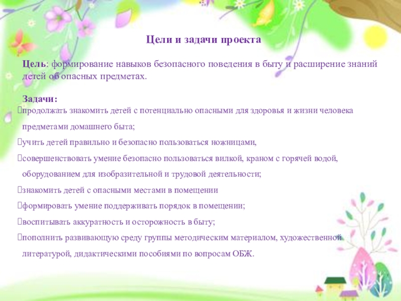 Цели и задачи проектаЦель: формирование навыков безопасного поведения в быту и расширение знаний детей об опасных предметах.Задачи:продолжать