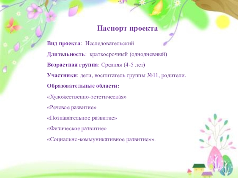 Паспорт проектаВид проекта: ИсследовательскийДлительность: краткосрочный (однодневный)Возрастная группа: Средняя (4-5 лет)Участники: дети, воспитатель группы №11, родители.Образовательные области:«Художественно-эстетическая»«Речевое развитие»«Познавательное развитие» «Физическое развитие»«Социально-коммуникативное развитие»».