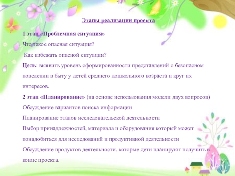 Этапы реализации проекта1 этап «Проблемная ситуация»Что такое опасная ситуация? Как избежать опасной ситуации?Цель: выявить уровень сформированности представлений