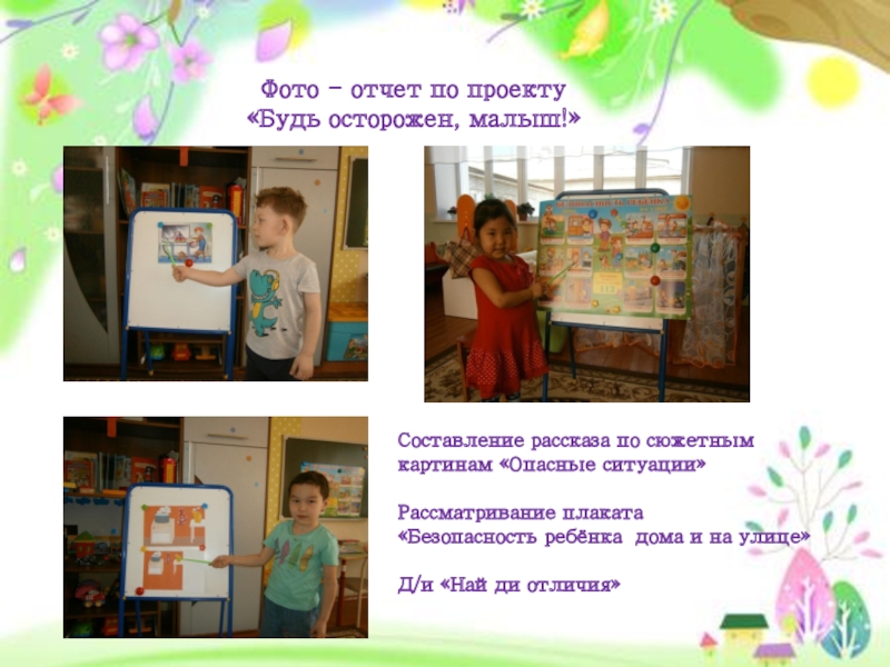 Фото - отчет по проекту «Будь осторожен, малыш!»Составление рассказа по сюжетным картинам «Опасные ситуации»Рассматривание плаката «Безопасность ребёнка