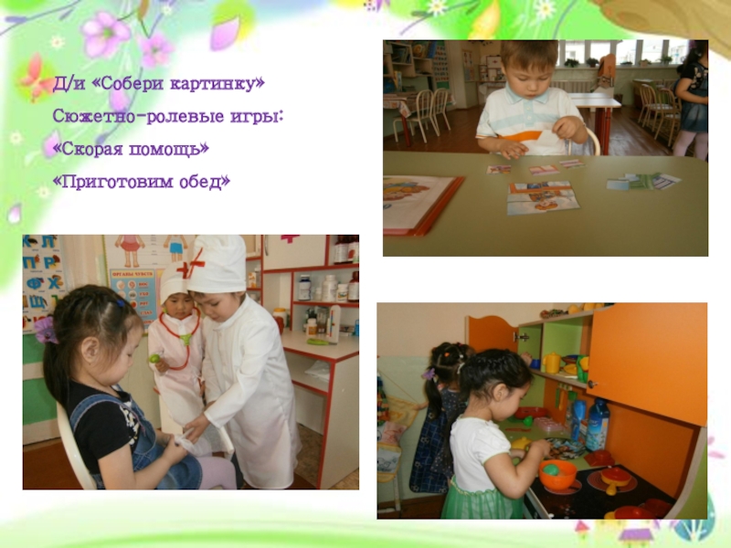 Д/и «Собери картинку»Сюжетно-ролевые игры:«Скорая помощь»«Приготовим обед»