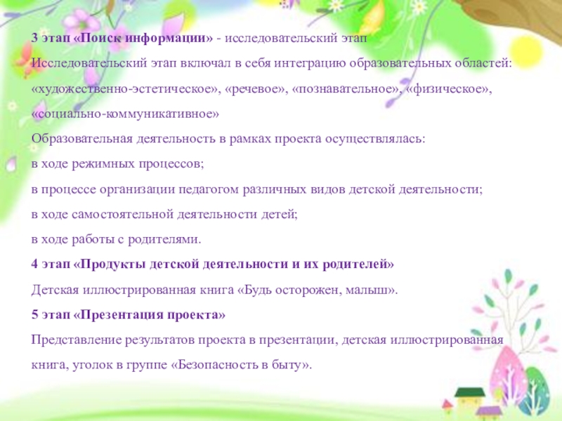 3 этап «Поиск информации» - исследовательский этапИсследовательский этап включал в себя интеграцию образовательных областей: «художественно-эстетическое», «речевое», «познавательное»,