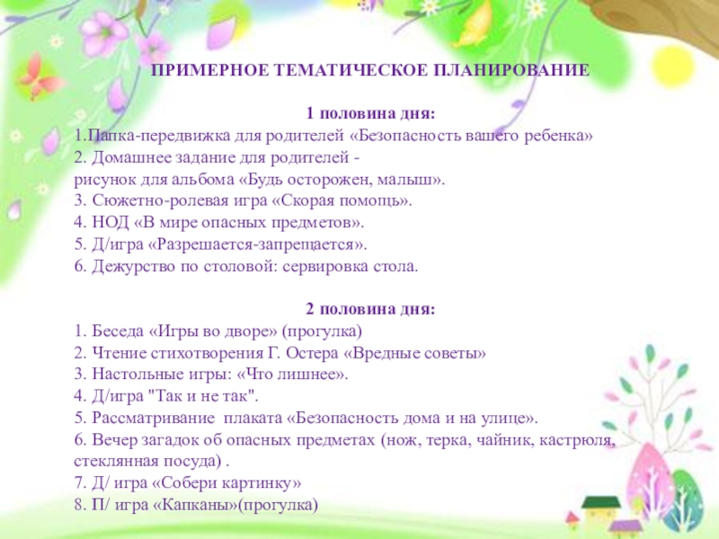 ПРИМЕРНОЕ ТЕМАТИЧЕСКОЕ ПЛАНИРОВАНИЕ1 половина дня:1.Папка-передвижка для родителей «Безопасность вашего ребенка»2. Домашнее задание для родителей -рисунок для альбома