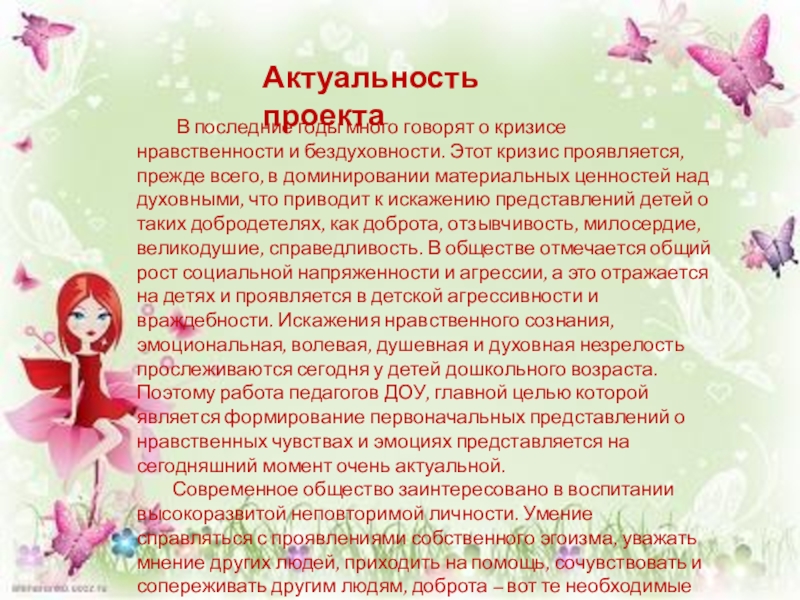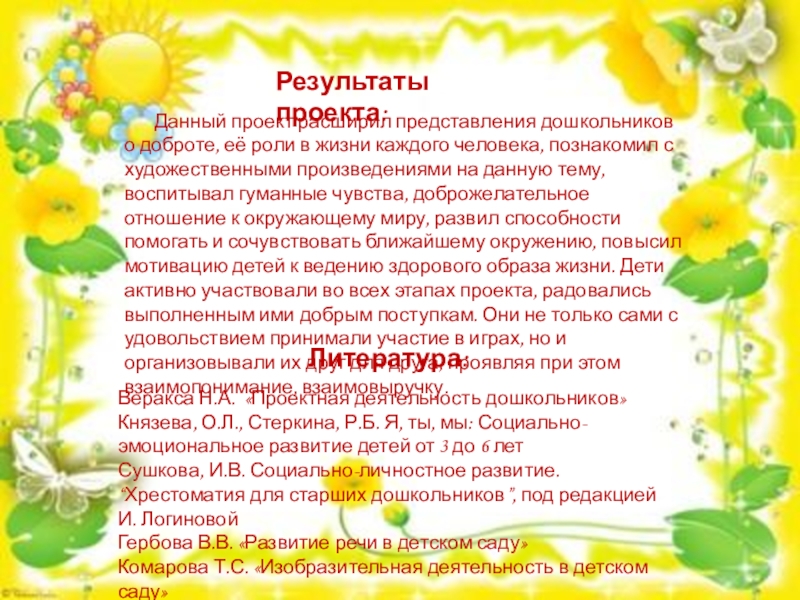 Данный проект расширил представления дошкольников о доброте, её роли в жизни каждого человека, познакомил с художественными произведениями на данную тему, воспитывал гуманные чувства, доброжелательное отношение к окружающему миру, развил способности помогать и сочувствовать ближайшему окружению, повысил мотивацию детей к ведению здорового образа жизни. Дети активно участвовали во всех этапах проекта, радовались выполненным ими добрым поступкам. Они не только сами с удовольствием принимали участие в играх, но и организовывали их друг для друга, проявляя при этом взаимопонимание, взаимовыручку.