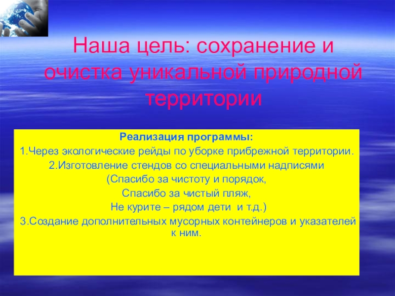 Наша цель: сохранение и очистка уникальной природной территории Реализация программы:1.Через экологические рейды по уборке прибрежной территории.2.Изготовление стендов