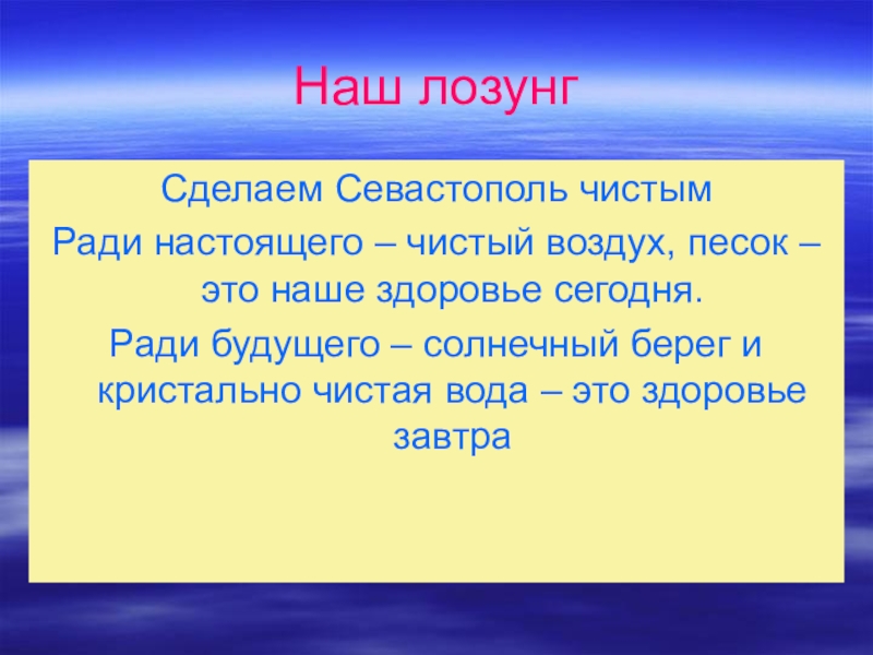 Наш лозунгСделаем Севастополь чистымРади настоящего – чистый воздух, песок – это наше здоровье сегодня.Ради будущего – солнечный