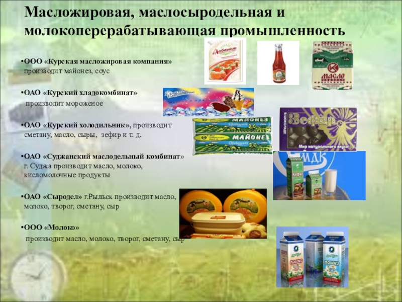 ОАО «Курский холодильник», производит сметану, масло, сыры, зефир и т. д.