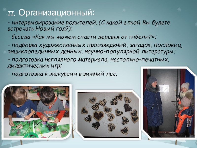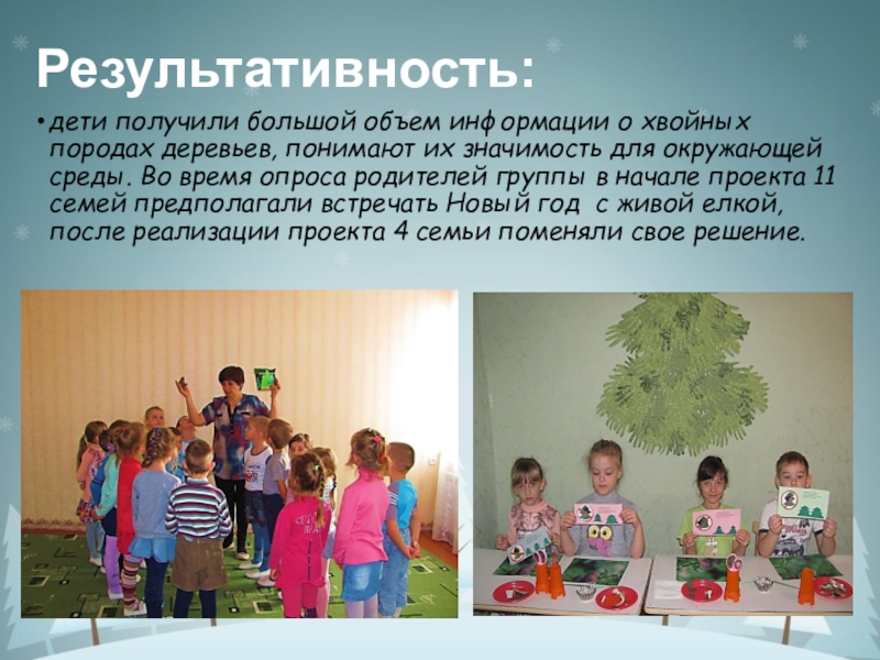 их значимость для окружающей среды. Во время опроса родителей группы в начале проекта 11 семей предполагали встречать Новый год с живой елкой, после реализации проекта 4 семьи поменяли свое решение.