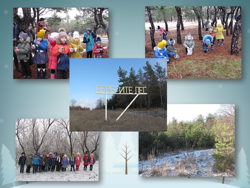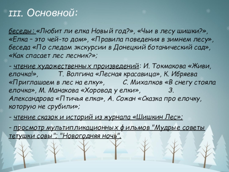 «Елка – это чей-то дом», «Правила поведения в зимнем лесу», беседа «По следам экскурсии в Донецкий ботанический сад», «Как спасает лес лесник?»;
