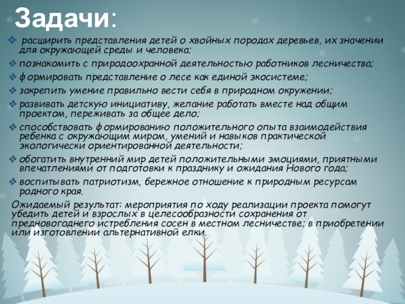 привлечь детей и родителей к проблеме сохранения сосен в местном лесничестве в период подготовки к празднованию Нового года. Повысить экологическую грамотность всех участников проекта.