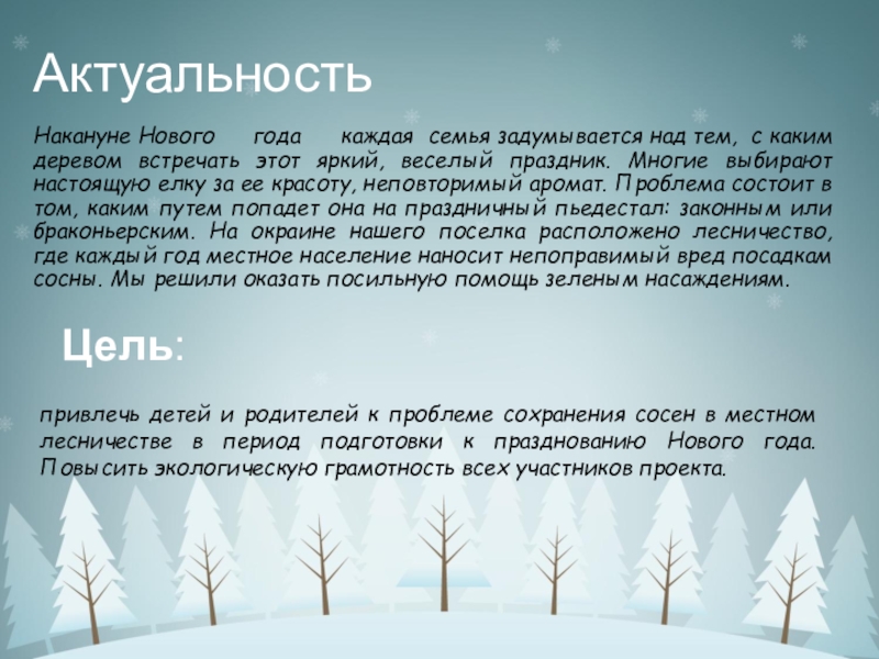 встречать этот яркий, веселый праздник. Многие выбирают настоящую елку за ее красоту, неповторимый аромат. Проблема состоит в том, каким путем попадет она на праздничный пьедестал: законным или браконьерским. На окраине нашего поселка расположено лесничество, где каждый год местное население наносит непоправимый вред посадкам сосны. Мы решили оказать посильную помощь зеленым насаждениям.