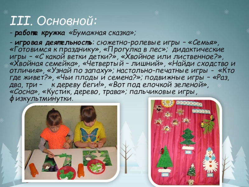 «Семья», «Готовимся к празднику», «Прогулка в лес»; дидактические игры – «С какой ветки детки?», «Хвойное или лиственное?», «Хвойная семейка», «Четвертый – лишний», «Найди сходство и отличия», «Узнай по запаху»; настольно-печатные игры - «Кто где живет?», «Чьи плоды и семена?»; подвижные игры – «Раз, два, три – к дереву беги!», «Вот под елочкой зеленой», «Сосна», «Кустик, дерево, трава»; пальчиковые игры, физкультминутки.