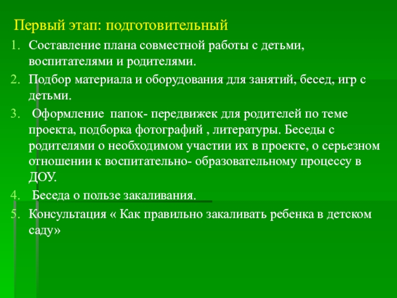 Оформление папок- передвижек для родителей по теме проекта, подборка фотографий , литературы. Беседы с родителями о необходимом участии их в проекте, о серьезном отношении к воспитательно- образовательному процессу в ДОУ.