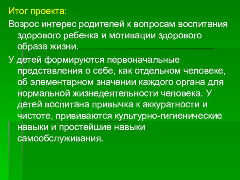 У детей формируются первоначальные представления о себе, как отдельном человеке, об элементарном значении каждого органа для нормальной жизнедеятельности человека. У детей воспитана привычка к аккуратности и чистоте, прививаются культурно-гигиенические навыки и простейшие навыки самообслуживания.