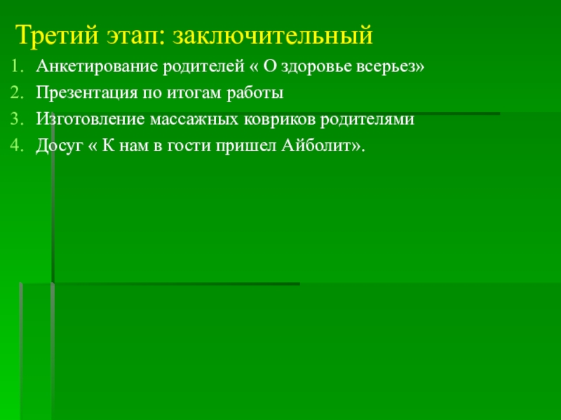Предполагаемый результат: активизировать интерес детей к здоровому образу жизни; повышение степени участия родителей в педагогическом процессе