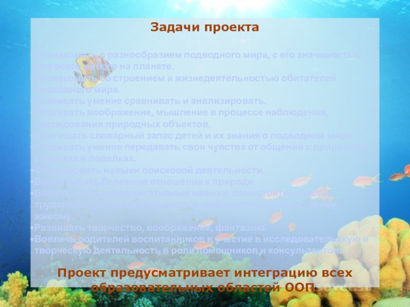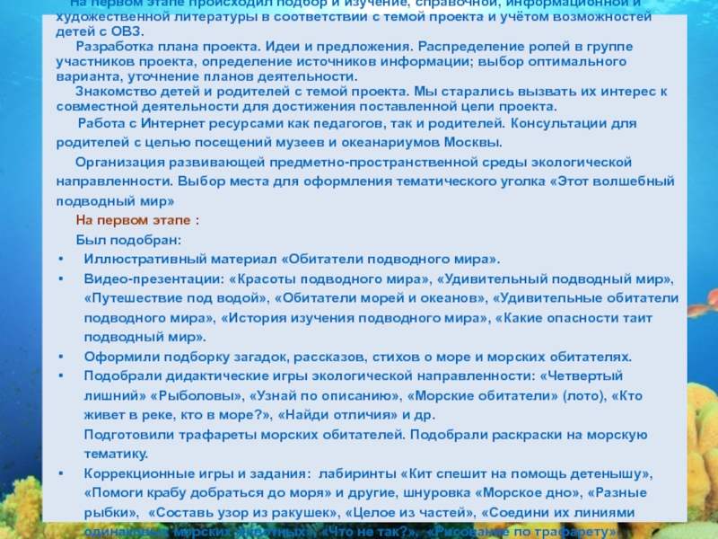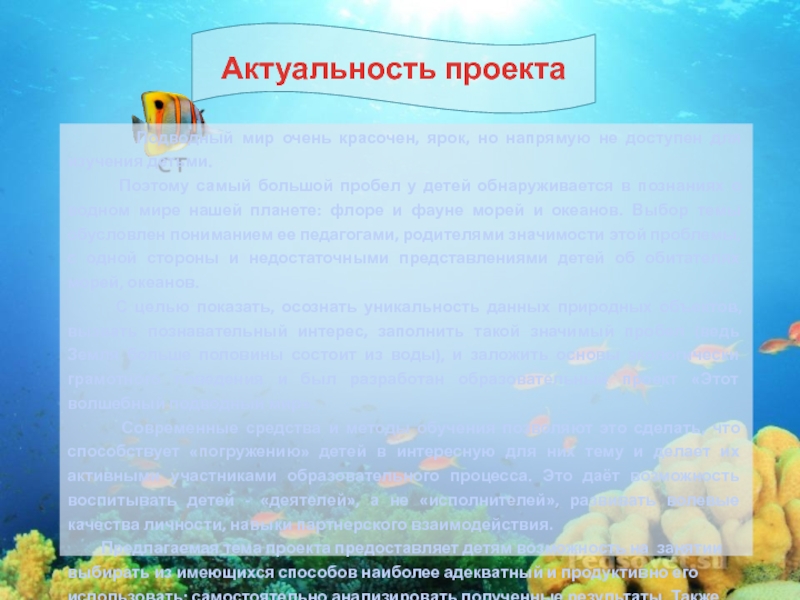 С целью показать, осознать уникальность данных природных объектов, вызвать познавательный интерес, заполнить такой значимый пробел (ведь Земля больше половины состоит из воды), и заложить основы экологически грамотного поведения и был разработан образовательный проект «Этот волшебный подводный мир».