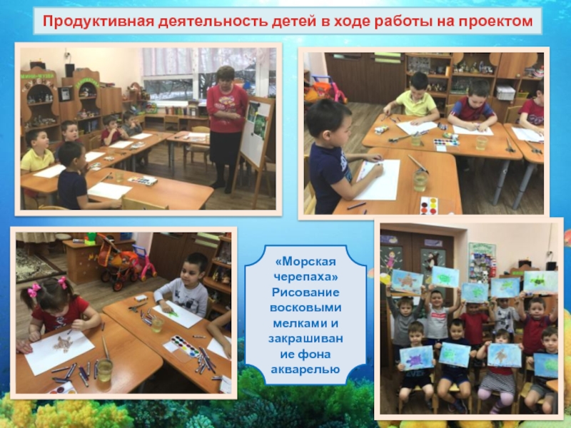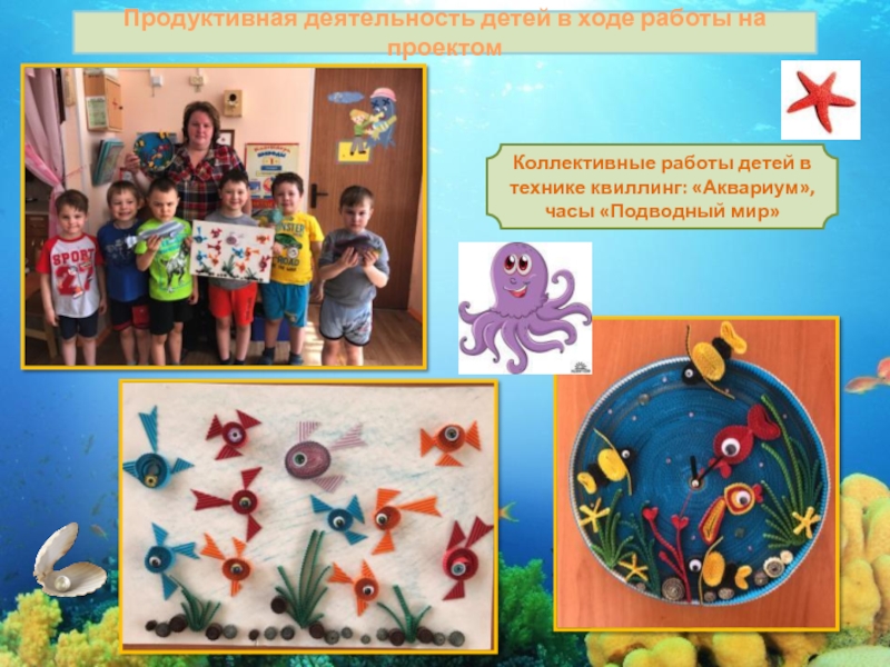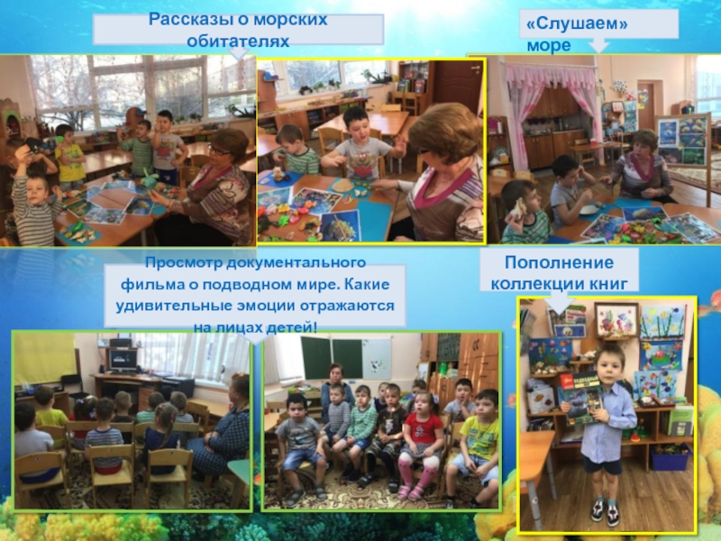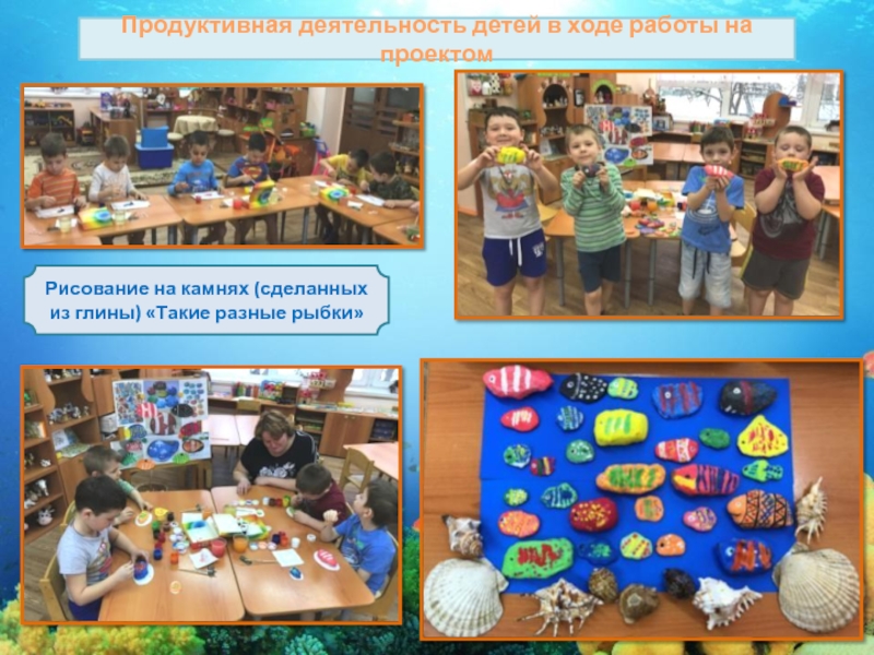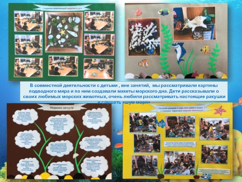 подводного мира и по ним создавали макеты морского дна. Дети рассказывали о своих любимых морских животных, очень любили рассматривать настоящие ракушки и слушать «шум моря»