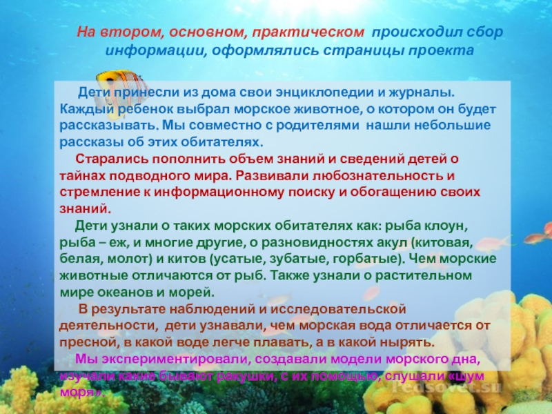 Слайд 7На втором, основном, практическом происходил сбор информации, оформлялись страницы проекта