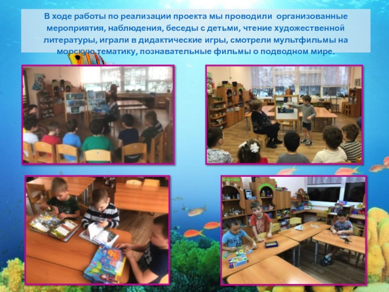 беседы с детьми, чтение художественной литературы, играли в дидактические игры, смотрели мультфильмы на морскую тематику, познавательные фильмы о подводном мире.