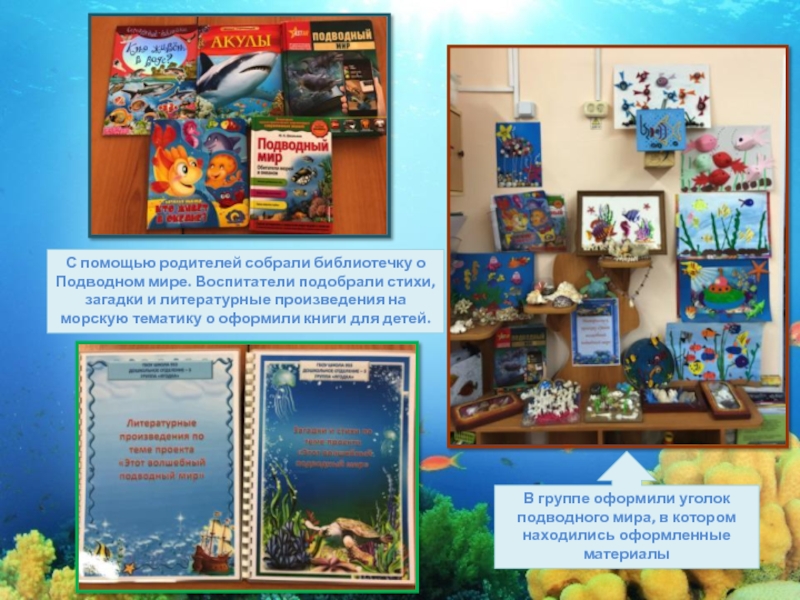 помощью родителей собрали библиотечку о Подводном мире. Воспитатели подобрали стихи, загадки и литературные произведения на морскую тематику о оформили книги для детей.