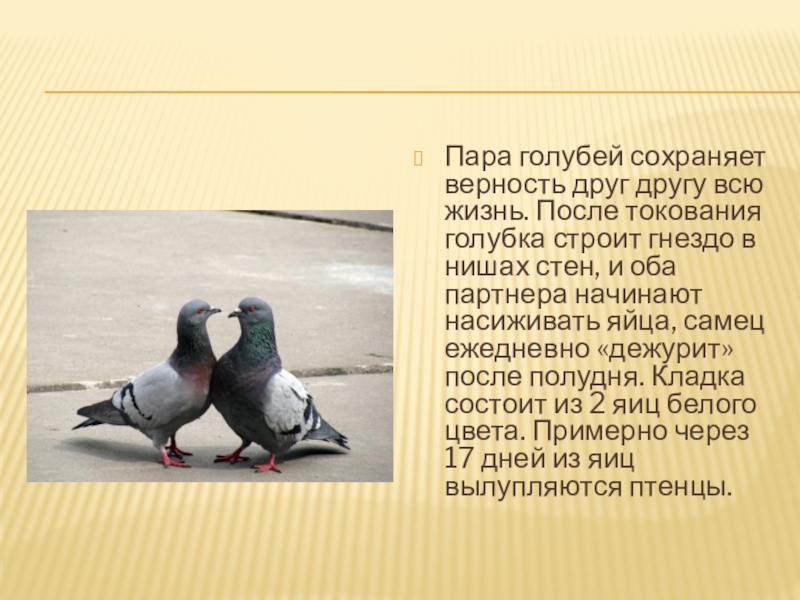 Слайд 6Пара голубей сохраняет верность друг другу всю жизнь. После токования голубка