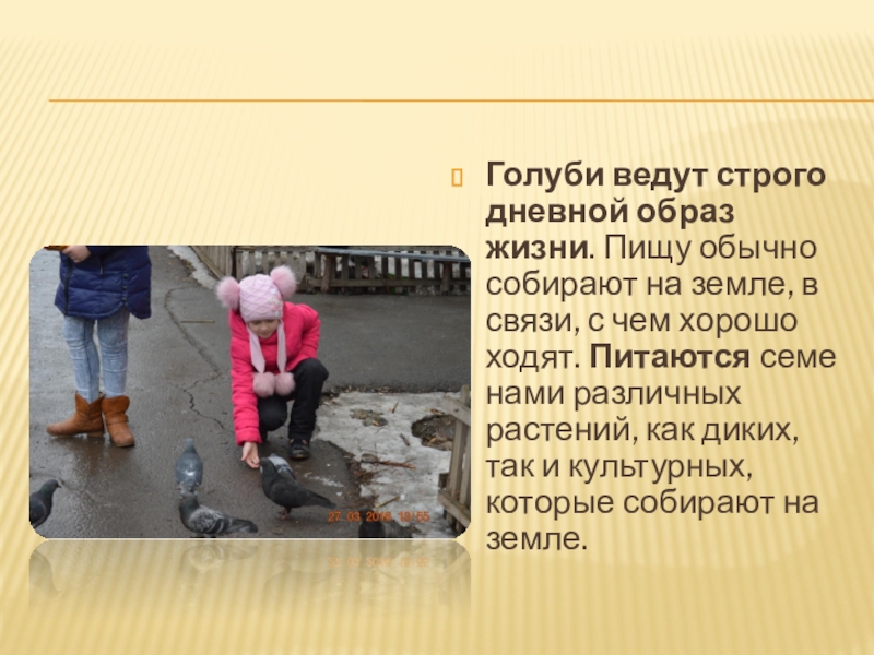 Слайд 5Голуби ведут строго дневной образ жизни. Пищу обычно собирают на земле,