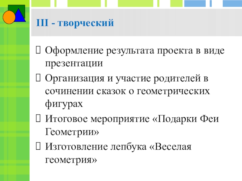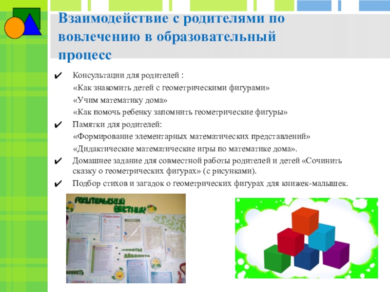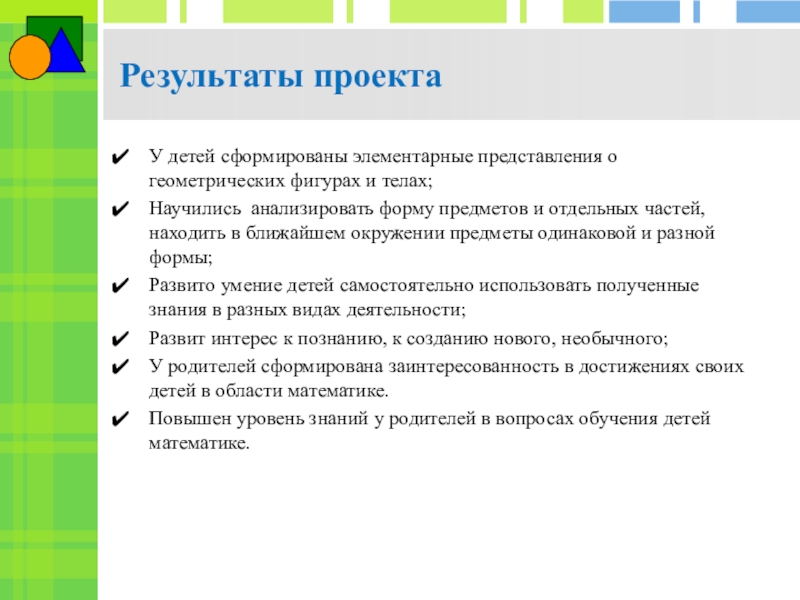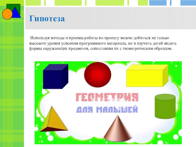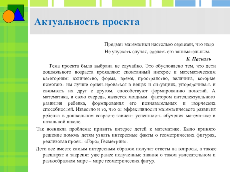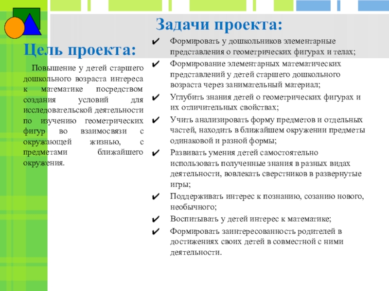 Повышение у детей старшего дошкольного возраста интереса к математике посредством создания условий для исследовательской деятельности по изучению геометрических фигур во взаимосвязи с окружающей жизнью, с предметами ближайшего окружения.