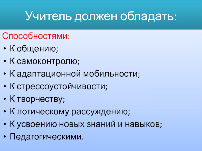 Учитель должен обладать:Способностями:К общению;К самоконтролю;К адаптационной мобильности;К стрессоустойчивости;К творчеству;К логическому рассуждению;К усвоению новых знаний и навыков;Педагогическими.