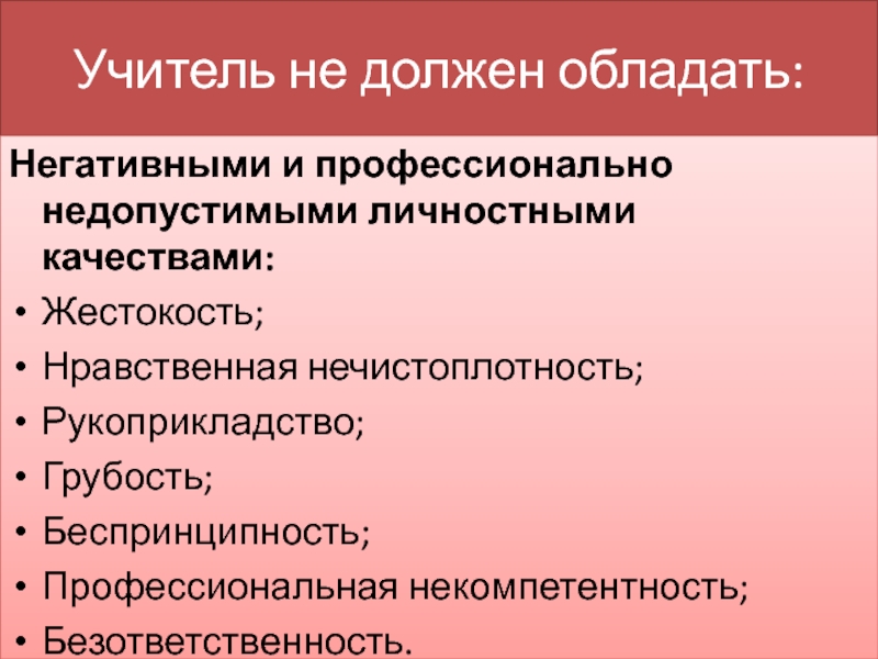 Учитель не должен обладать:Негативными и профессионально недопустимыми личностными качествами:Жестокость;Нравственная нечистоплотность;Рукоприкладство;Грубость;Беспринципность;Профессиональная некомпетентность;Безответственность.