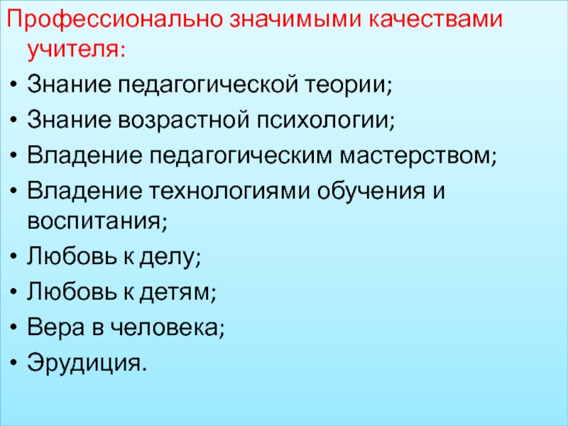 Профессионально значимыми качествами учителя:Знание педагогической теории;Знание возрастной психологии;Владение педагогическим мастерством;Владение технологиями обучения и воспитания;Любовь к делу;Любовь к