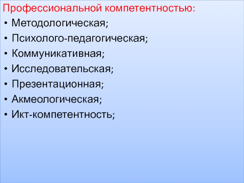 Профессиональной компетентностью:Методологическая;Психолого-педагогическая;Коммуникативная;Исследовательская;Презентационная;Акмеологическая;Икт-компетентность;