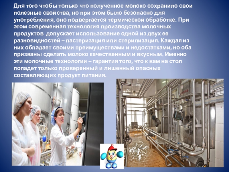 но при этом было безопасно для употребления, оно подвергается термической обработке. При этом современная технология производства молочных продуктов допускает использование одной из двух ее разновидностей – пастеризация или стерилизация. Каждая из них обладает своими преимуществами и недостатками, но оба призваны сделать молоко качественным и вкусным. Именно эти молочные технологии – гарантия того, что к вам на стол попадет только проверенный и лишенный опасных составляющих продукт питания.