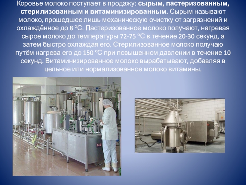 Слайд 24Коровье молоко поступает в продажу: сырым, пастеризованным, стерилизованным и витаминизированным. Сырым
