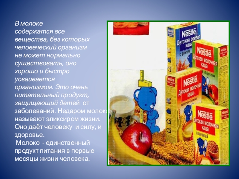защищающий детей от заболеваний. Недаром молоко называют эликсиром жизни. Оно даёт человеку и силу, и здоровье.